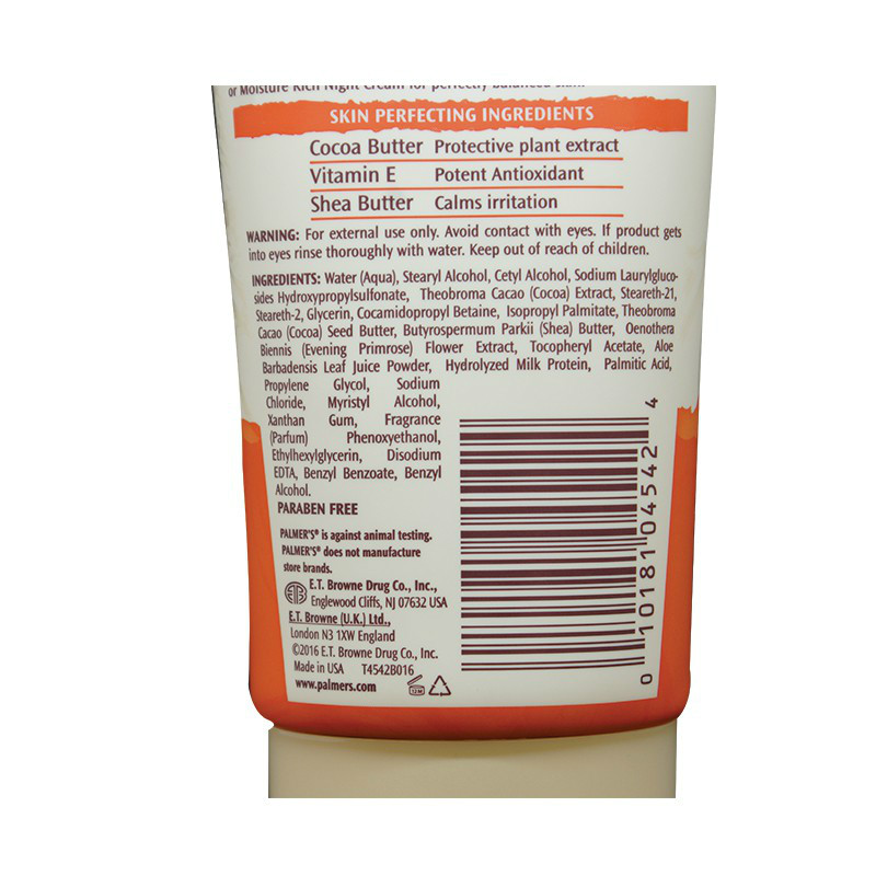 - Bơ ca cao: là công thức bơ độc quyền của Palmer’s và là thành phần luôn luôn được ứng dụng để kết hợp cùng các thành phần khác nhằm mang lại hiệu quả tối đa cho các sản phẩm chăm sóc da. Trong bơ có chứa các chất quý giá có công dụng dưỡng da đa năng. Bao gồm hàm lượng vitamin E, tinh chất béo và chất chống oxy hóa cao. Bơ ca cao giúp làm mềm những vùng da khô trên cơ thể, tăng độ đàn hồi cho da, giúp làm chậm quá trình lão hóa, xóa mờ nếp nhăn trên da.